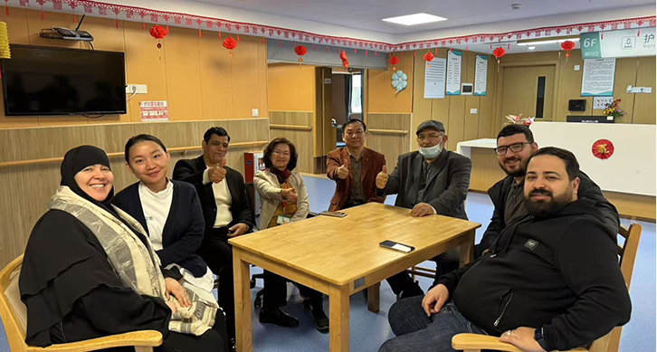 经过几天的调理,ABDELMAGEED先生,饮食睡眠良好,大小便正常,精神良好,肿瘤科团队给予ABDELMAGEED先生接受了胰腺肿瘤微血管介入术,纳米微球栓塞后的几天,效果非常显著,一家人围坐在病区大厅,开心地邀请肿瘤科张主任,陈护士长合影留念。计划休息几周后,做腹腔转移肿瘤病灶冷冻治疗。